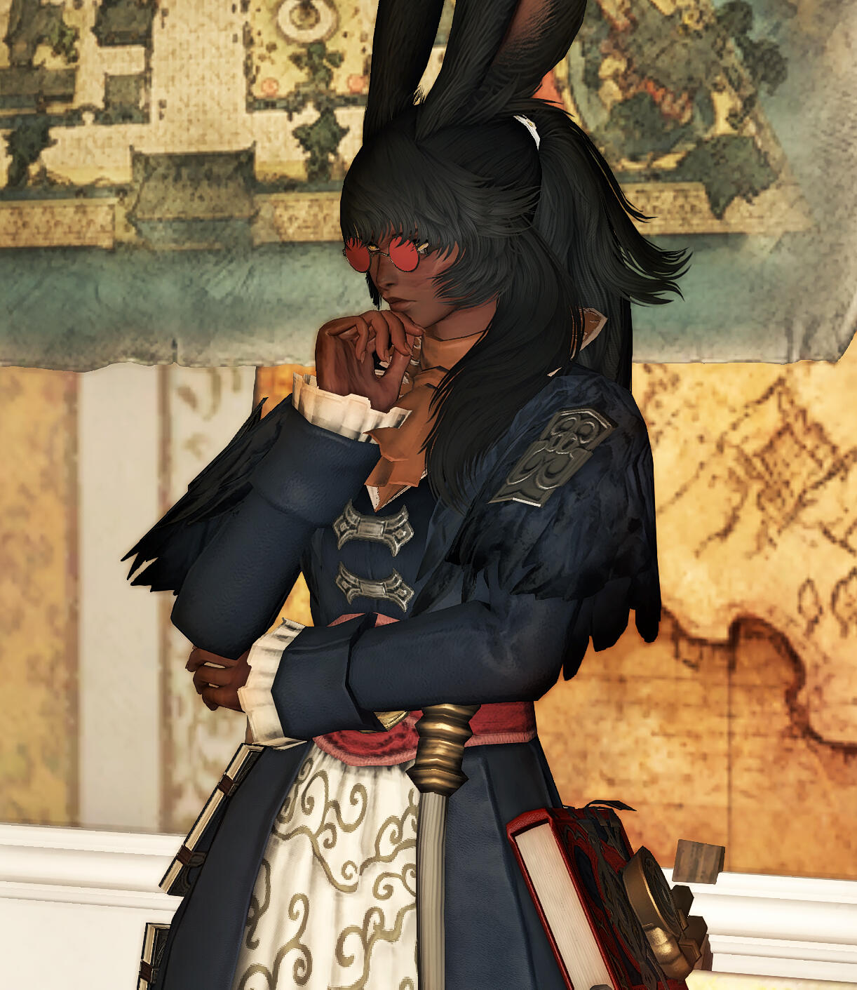 OCCUPATION / CartographerBASICS / A sociable, secretive, stumbling little mapmaker, Frida investigates dark and forbidden places in an effort to chart the strange and unseen pockets of Hydaelyn. She is a person constantly adrift, unsure of how to make meaningful connections within a world she has always cared very little about.APPEARANCE / Typical of her people, Frida is tall and slim, though her build is more lanky than graceful. Her skin is dark and umber-toned, and her hair a tangled, coal-colored mess that is given little regard when it comes to styling. She's usually drowned in conservative, comfortable clothing fit for travel that's accompanied by the faint smell of old ink and dried paint.Frida is never without a pair of spectacles, and behind them the skin around her eyes is fibrous and pinched with heavy burn scars that run across the top half of her face and down her left cheek, neck, and shoulder. Her hands are similarly blemished, the burns leaving a pitted, webbed texture that runs up past her wrists and over most of her forearms. There is sometimes a general stiffness to the movements of her fingers, as though the scarred skin across them is stretched too taut.